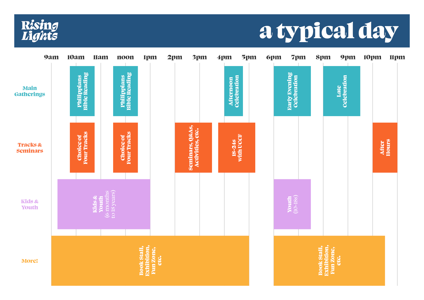 Rising Lights will have a mix of Bible teaching, sung praise, family gatherings, and seminars as well as activities for all age groups. There will be a bookstall provided to us by 10ofThose and an exhibition of partner organisations from parachurch groups across the country.